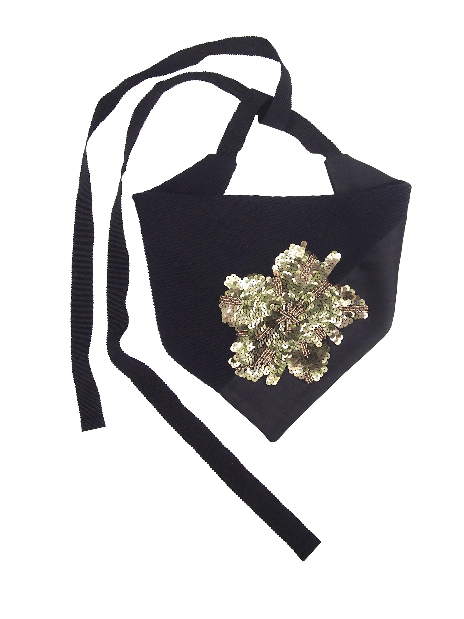 Kleines Halstuch mit Paillettenapplikation Classy in Black - hier ist die Paillettenapplikation in oliv und gold-farbenen Nuancen der Eyecatcher. Die feine Blume aus Glasperlen und Pailletten schmiegt sich ganz wunderbar auf die weiche Wolle und den Seidensatin in...Mehr lesen