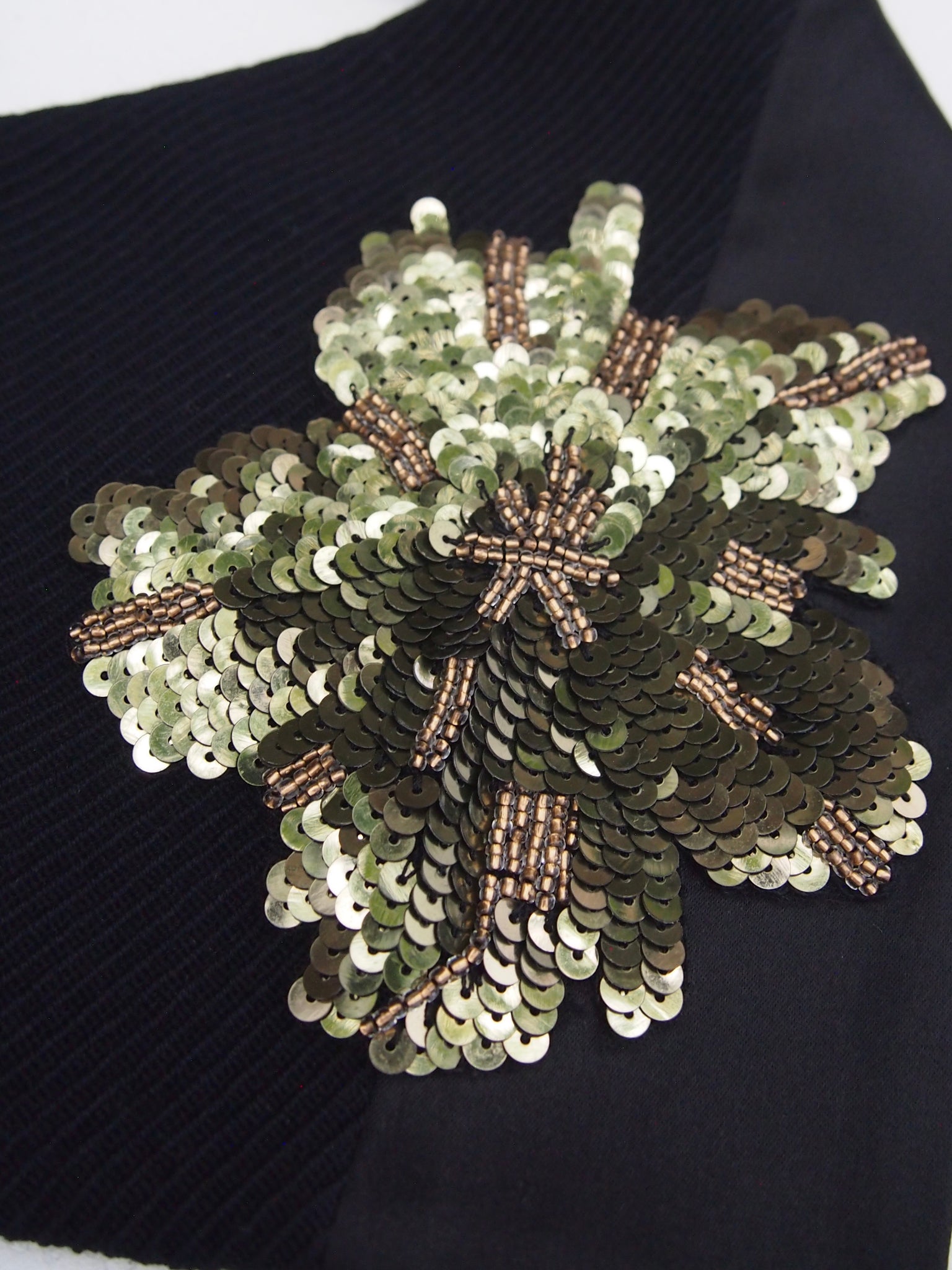 Classy in Black - hier ist die Paillettenapplikation in oliv und gold-farbenen Nuancen der Eyecatcher. Die feine Blume aus Glasperlen und Pailletten schmiegt sich ganz wunderbar auf die weiche Wolle und den Seidensatin in schwarz. Ein Accessoire, das im Handumdrehen jedes schlichte Outfit in einen eleganten und gleichzeitig lässig Look verwandelt. Ein Tuch als Schmuckstück. Alltagstauglich und glamourös zugleich.