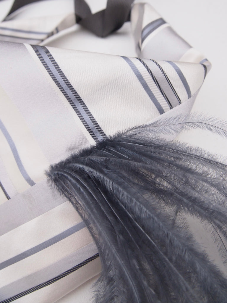 SHINY STRIPES - ein kunstvolles Accessoire für den Hals. Die grafischen Streifen in Grau und Silber auf der zarten Seide verleihen diesem Tuch eine moderne und elegante Note, während die grauen Federn eine subtile...