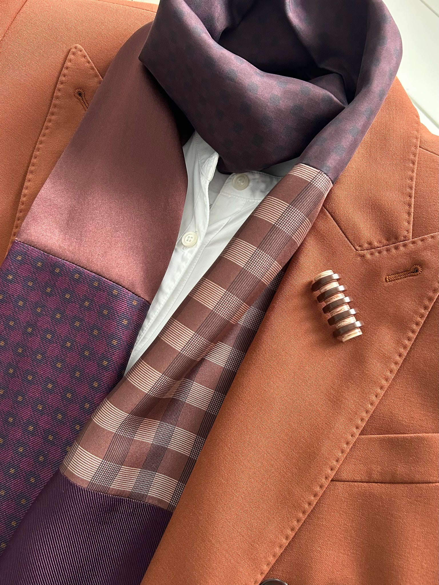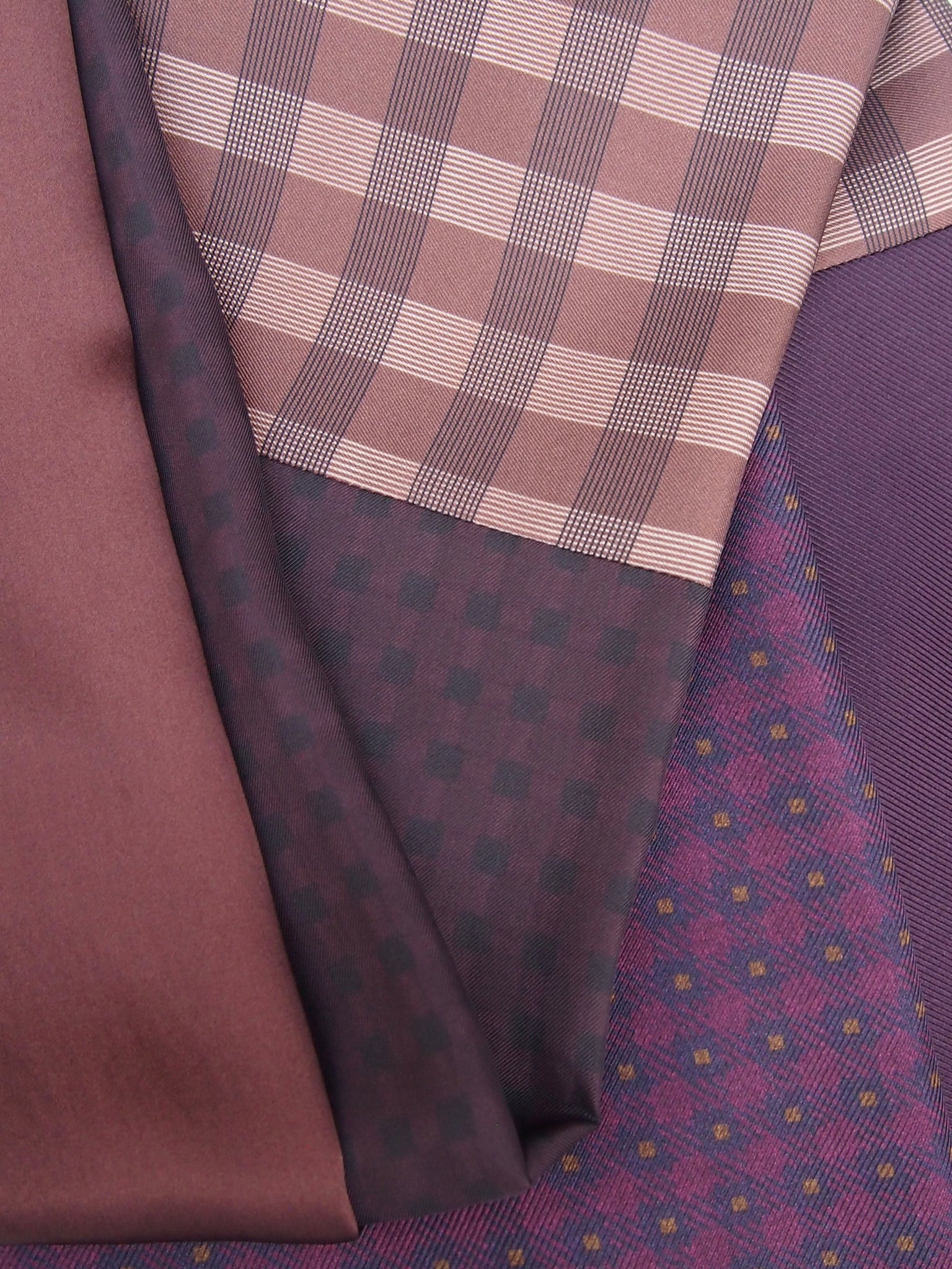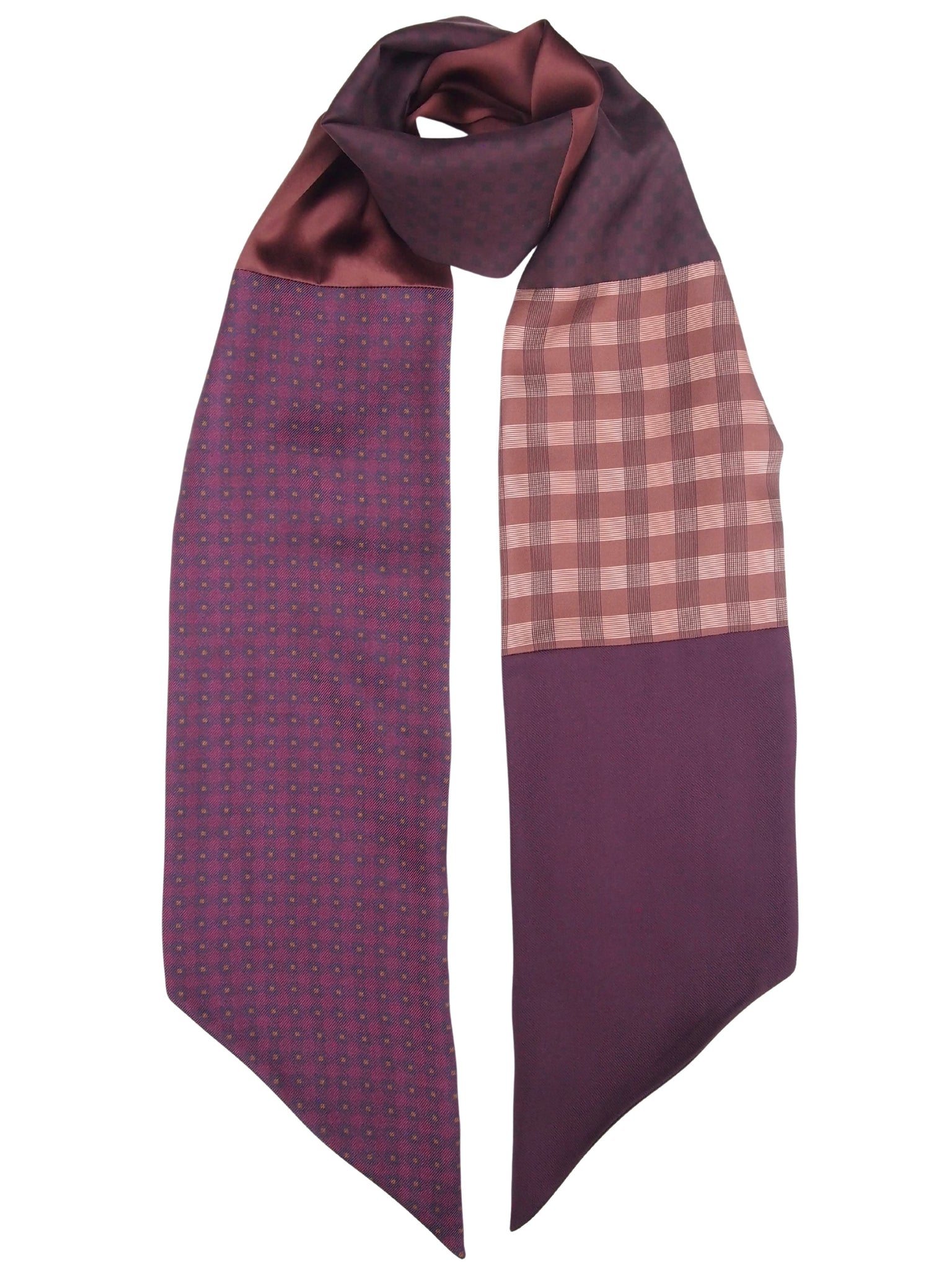 BROWN & BURGUNDY - zwischen Retro-Charme und moderner Lässigkeit. Der lange Schal MARANOLA ist aus fünf verschiedenen Seidenstoffen gearbeitet - zwei Krawattenseiden in Bordeaux- und Brauntönen kombiniert mit einem Seidentwill und Satin in Aubergine und Kastanienbraun. Die aktuellen Trendfarben, umgesetzt mit Leichtigkeit und grafischer Strenge. Stilvoll und unerwartet zugleich.